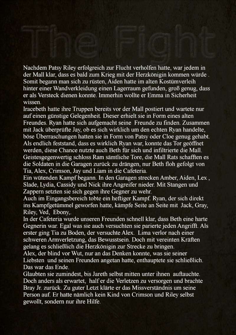 Natürlich war mit Reibereien während der Versammlung zu rechnen, vor allem Lex tut seinem Unmut kund. Allerdings war er der Einzige, der Alex und Crimson nicht in den Tribe aufnehmen wollte. Dachte er zumindest, doch auch Amber`s Hand blieb bei der Abstimmung unten. Schließlich dürfen alle bleiben, obwohl das Glück auch von einigen Abschieden beschattet wird. Liam und Gel begeben sich auf Wanderschaft, um seine innere Mitte zu finden. Lydia und Nick suchen Jareth und auch May hat sich von Salene verabschiedet, sie hat alles mit Zak nie wirklich geklärt. Ellie ist vollkommen fertig, Jack verkraucht sich die ganze Zeit in seinem Zimmer und auch Alice hat die Mall verlassen, Trudy nimmt sich ihrer Sorgen an. Doch auch sie hat eigenen Probleme, denn auch Sally ist in Ram verliebt. Nachdem Amber nun angenommen hat, dass alles geklärt ist, taucht neuer Ärger auf, zwei Fremde verschaffen sich Zutritt zur Mall, fremd? Doch nicht für alle. Tiarandear ist fassunglos, seine totgeglaubte Schwester steht vor ihm, doch sie ist ein Mann. Was genau ist damals passiert? Und