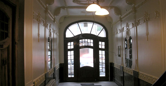 | Die Eingangshalle des blauen Hauses ist mit einer aufwendig verzierten Wand- und Deckentäfelung ausgestattet. Sie verbindet die beiden Wohnungen im Ergeschoss, das Treppenhaus und den Innenhof miteinander. - Nachrichten bitte nur hier hin senden, danke.