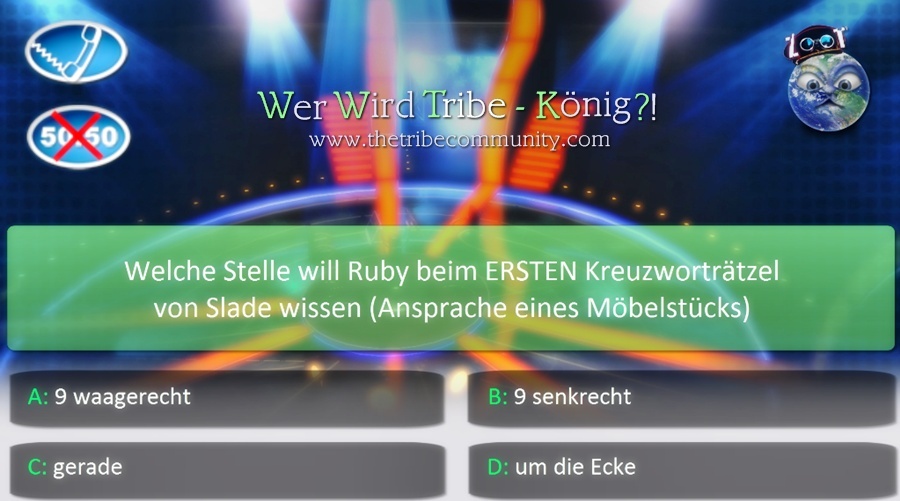 am Dienstag, 1. Oktober erscheint eine neue Ausgabe von "Wer wird Tribe-König? - *WWT-K?*". Ich möchte euch jetzt und hier schon einmal einen kleinen Einblick auf das Aussehen des The Tribe Quiz erlauben. Desweiteren möchten wir gern ab der nächsten Ausgabe von "Wer wird Tribe-König?" ein neues System einführen, ein Gewinnsystem. Bei jeder Frage gibt es "M" zu gewinnen. Die M's waren ein Zahlungsmittel in The Tribe, Ende Staffel 3 und Anfang Staffel 4.